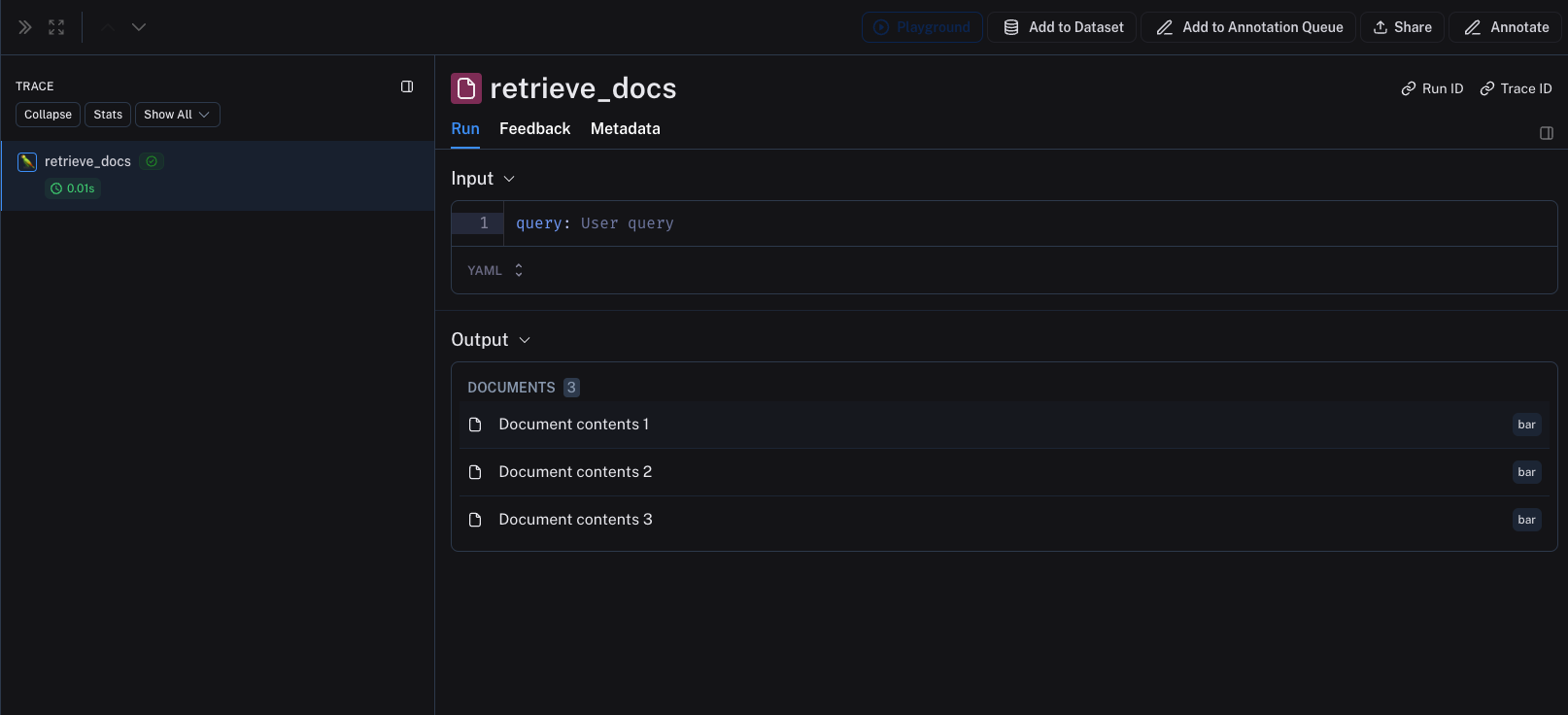 The following image shows how a retriever step is rendered in a trace. The contents along with the metadata are displayed with each document.